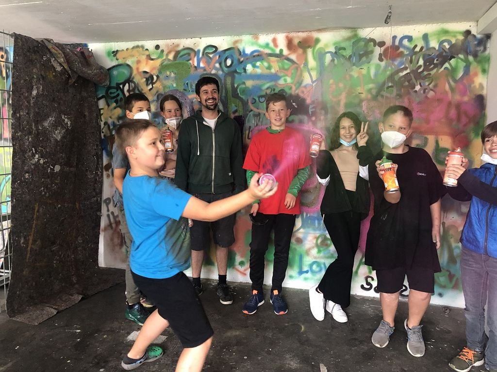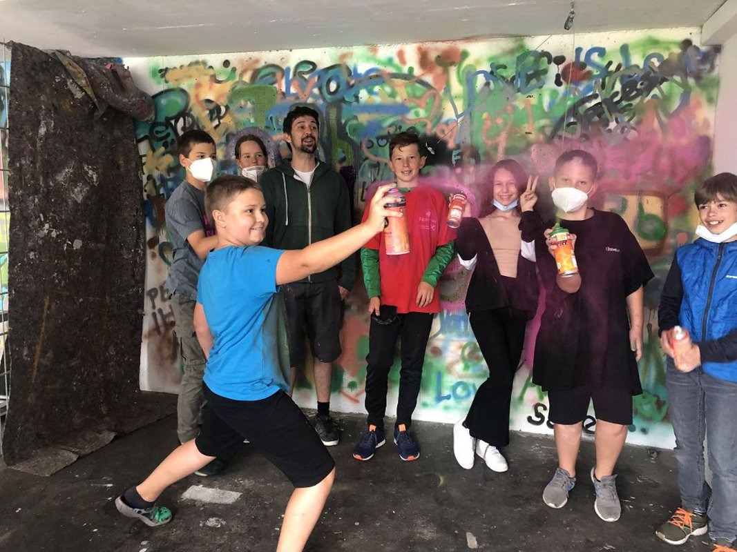 So entschieden sich die zweiten Klassen diese gemeinsam neu zu gestalten. Zuerst wurden die Wände von den Schülerinnen der KreativWerkstatt zwei Mal grundiert und nun ging unsere Suche nach einem Graffiti Künstler los.