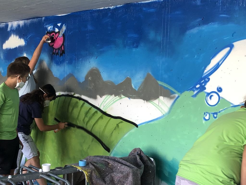 Unsere Fahrradgarage der Mittelschule, die vor Jahren von zwei Schulklassen mit einem Graffiti gestaltet wurde, ist leider in die Jahre gekommen, d.h. einige Jugendliche tobten sich mit Wortfetzen, die nicht unserem Schuldenken entsprechen, aus.