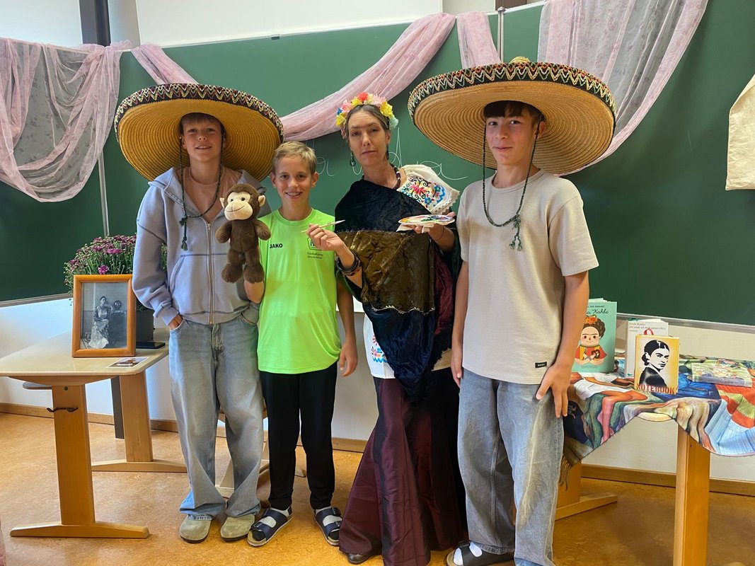 In unseren Atelierstunden am Donnerstag behandeln wir in Kunst das Thema Frida Kahlo. Vor Kurzem kam ein ganz besonderer Besuch: Katharina kam als Frida Kahlo verkleidet zu uns in die Schule! Sie sah der berühmten Künstlerin aus Mexiko wirklich ähnlich – mit Blumen im Haar, bunten Kleidern. Katharina, die ein großer Fan von Frida ist, erzählte uns viel Spannendes über das Leben von Frida Kahlo. Wir erfuhren, dass Frida schon als Kind krank war und später einen schweren Unfall hatte. Trotzdem ließ sie sich nicht unterkriegen und malte viele Bilder, in denen sie ihre Schmerzen zeigte. Sie war mutig, kreativ und eine sehr starke Frau. Besonders beeindruckend war, dass Katharina vor unseren Augen ein Bild im Stil von Frida Kahlo gemalt hat. Es war ein schönes Selbstbildnis. Das war die Einführung zu unserem Selbstbildnis- aber als Tier. So haben wir uns selber Tiere zugeschrieben und zuschreiben lassen. Sehr interessant war, was alles herausgekommen ist. Alle haben kreative Bilder gemalt als Tiere in verschiedenen Landschaften.