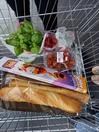 Letzten Mittwoch haben wir Spanier "Pan con tomate" zubereitet. Nach der Lesezeit haben wir uns gemeinsam auf den Weg zum Hofer gemacht. Tara und ich haben das Brot besorgt, Hanna und Teresia haben den Einkaufswagen geschoben und die dritten Klassen gemeinsam mit Lara haben das Basilikum geholt.