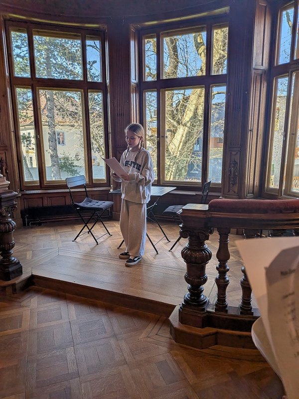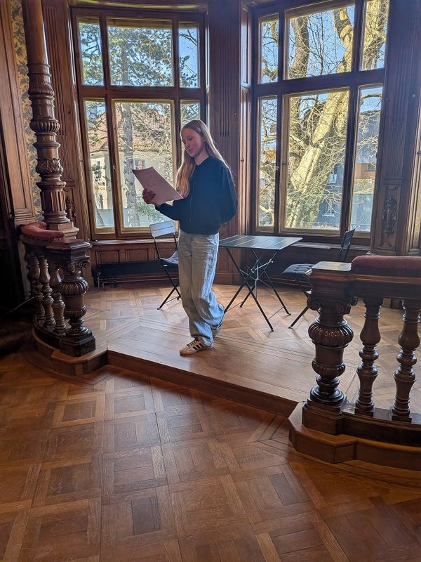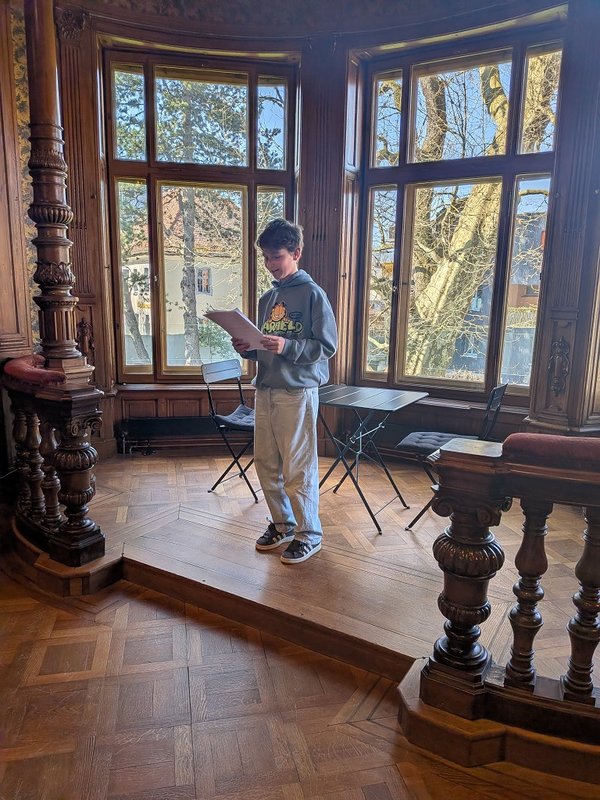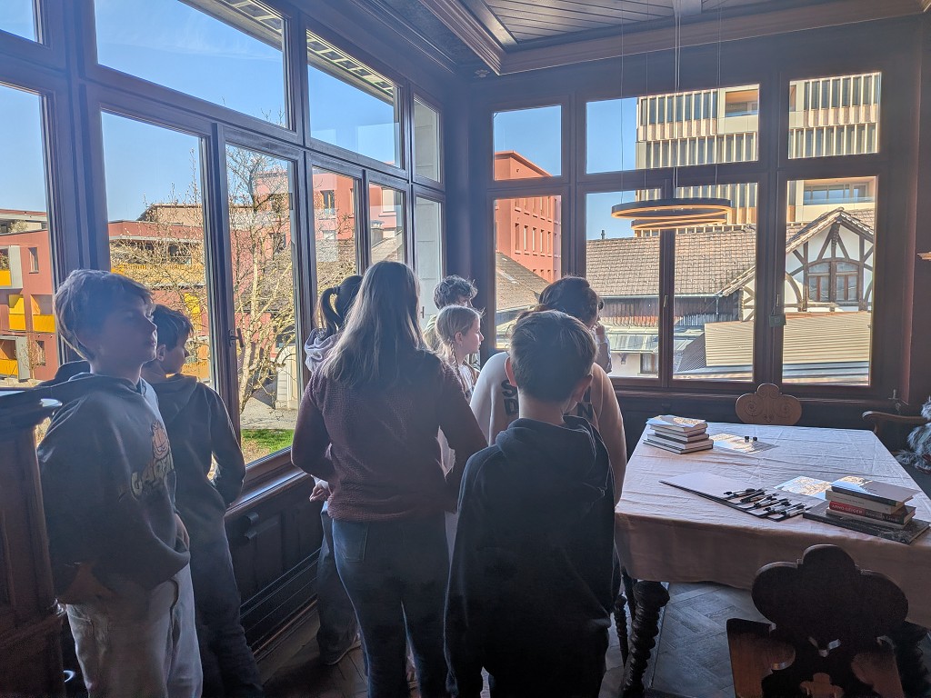 In der zweiten Unterrichtsstunde ging es los. Zuerst fuhren wir mit dem Bus nach Schwarzach und von dort aus mit dem Zug nach Hohenems. Am Literaturhaus angekommen, wurden wir freundlich begrüßt. Durch die alte Kutscheneinfahrt ging es zu der Garderobe und man erzählte uns viel über das Haus. Wir erfuhren, wie alt das Haus war, wem es früher gehörte und vieles mehr. Außerdem war ein großes Bild auf dem Fester, dessen Bedeutung man uns erklärte.