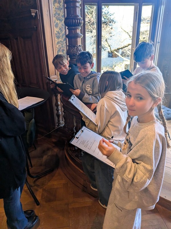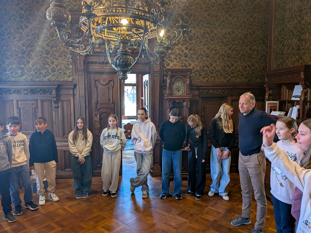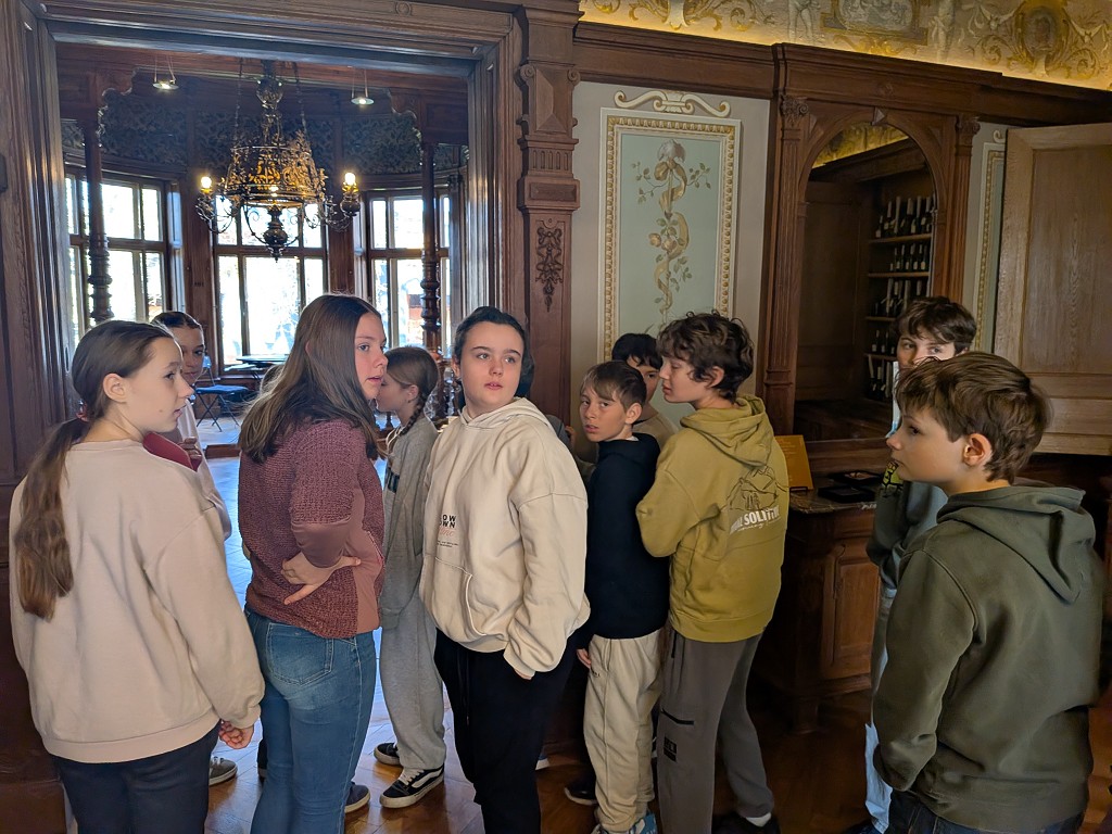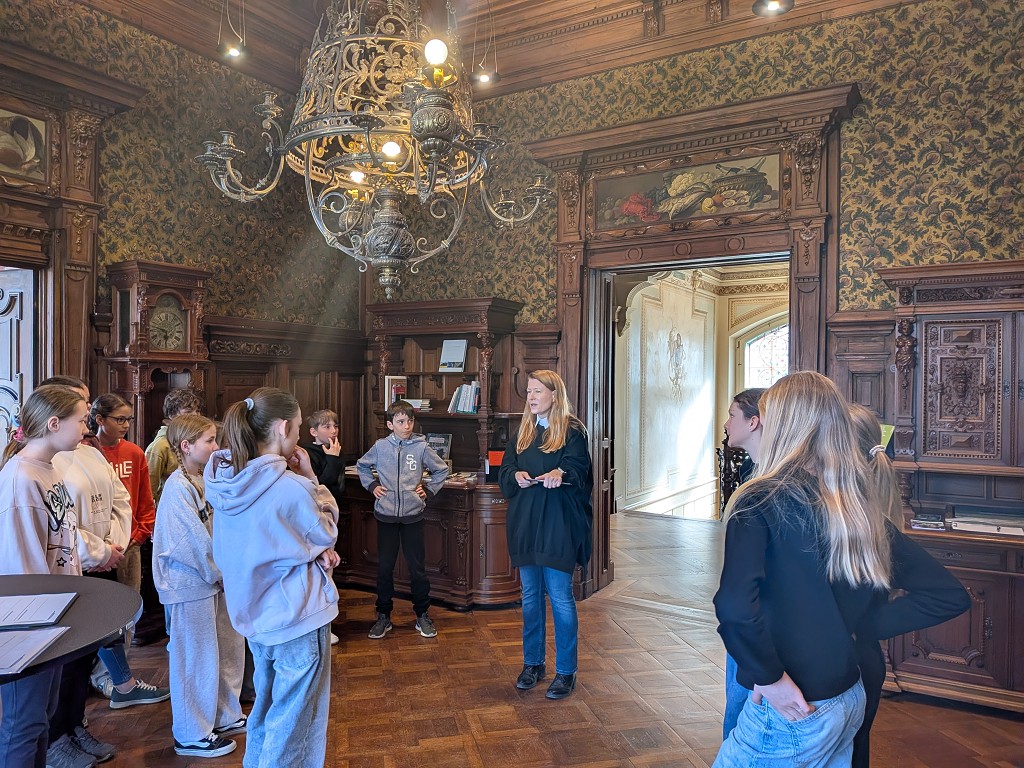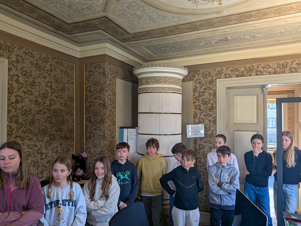 Dann wurden wir ins Esszimmer „geleitet“. Zuerst erkannten wir nicht, dass es das Esszimmer war, bis wir die Gemälde über den Türen entdeckten, auf denen Speisen abgebildet waren. Wir wurden dann noch durch den ersten Stock geführt und wir durften sogar in den Gang, den früher immer die Angestellten benutzten. Wir spielten noch ein lustiges Spiel und uns wurden die Stationen erklärt, die wir nun erledigen konnten.