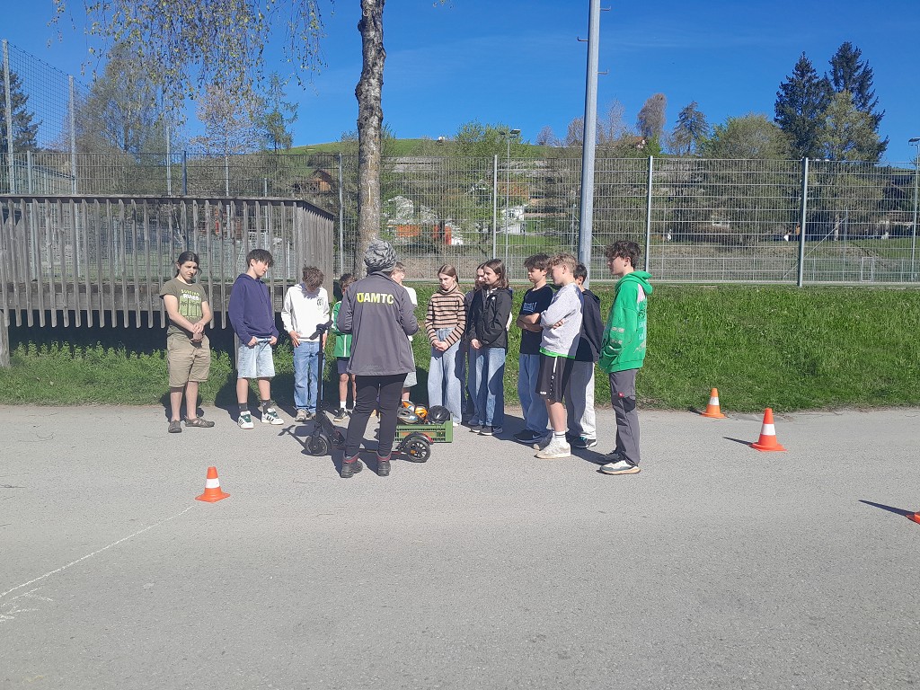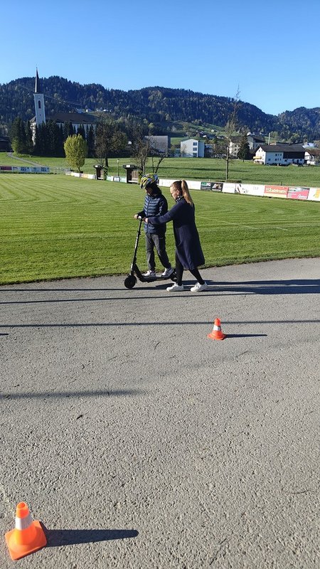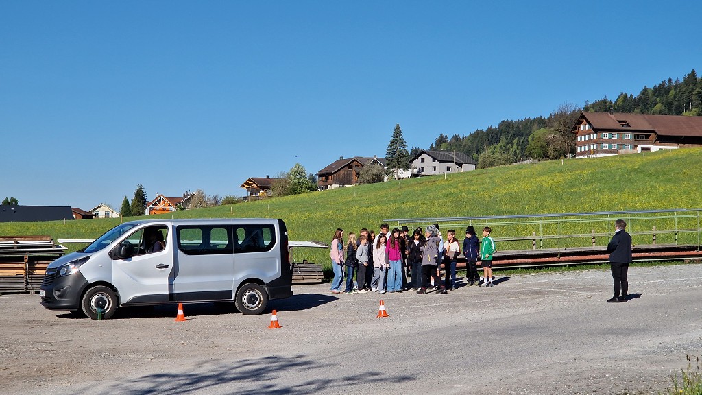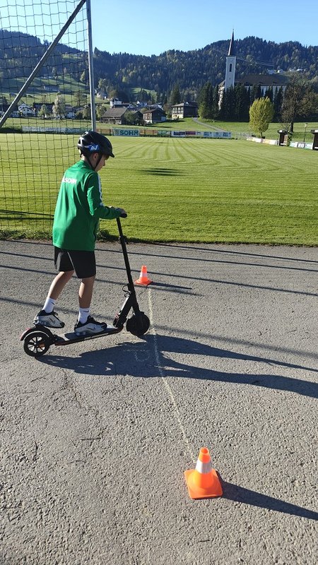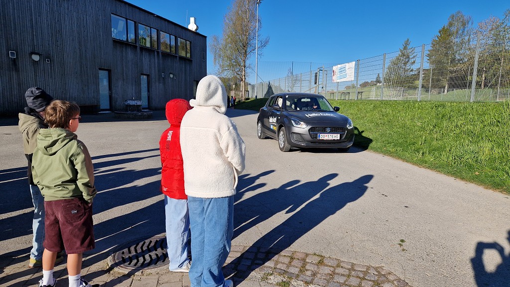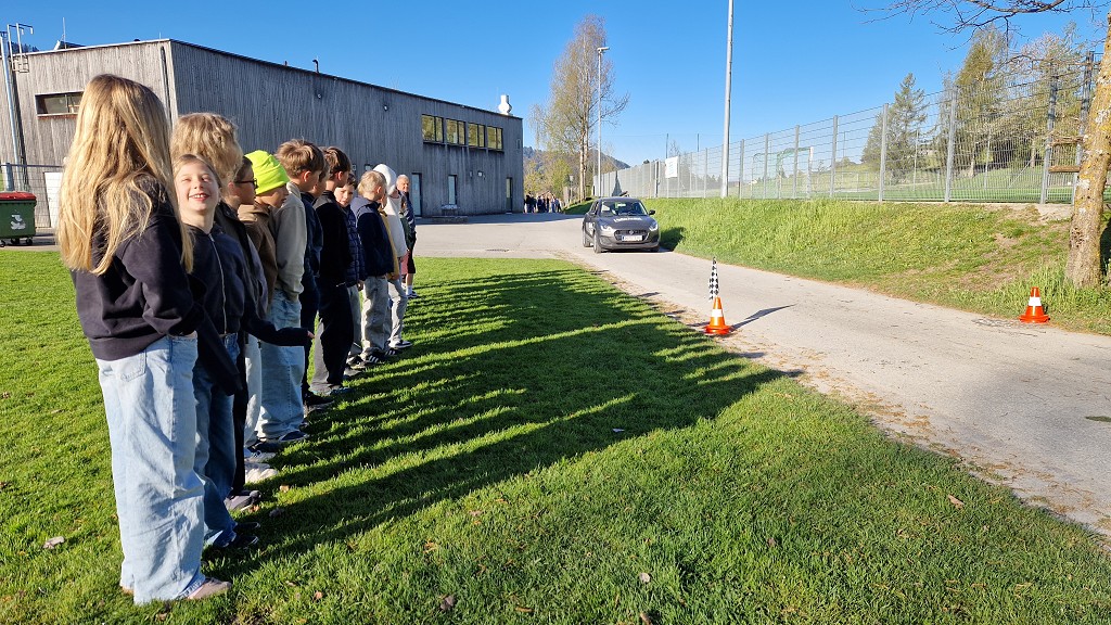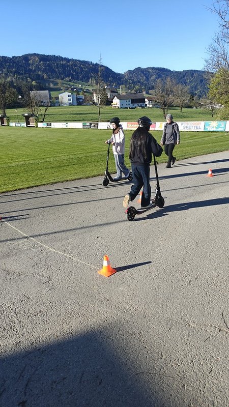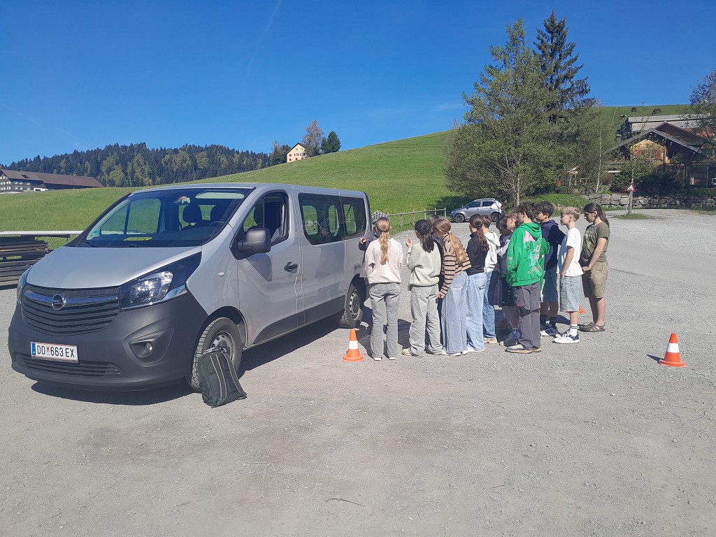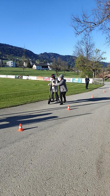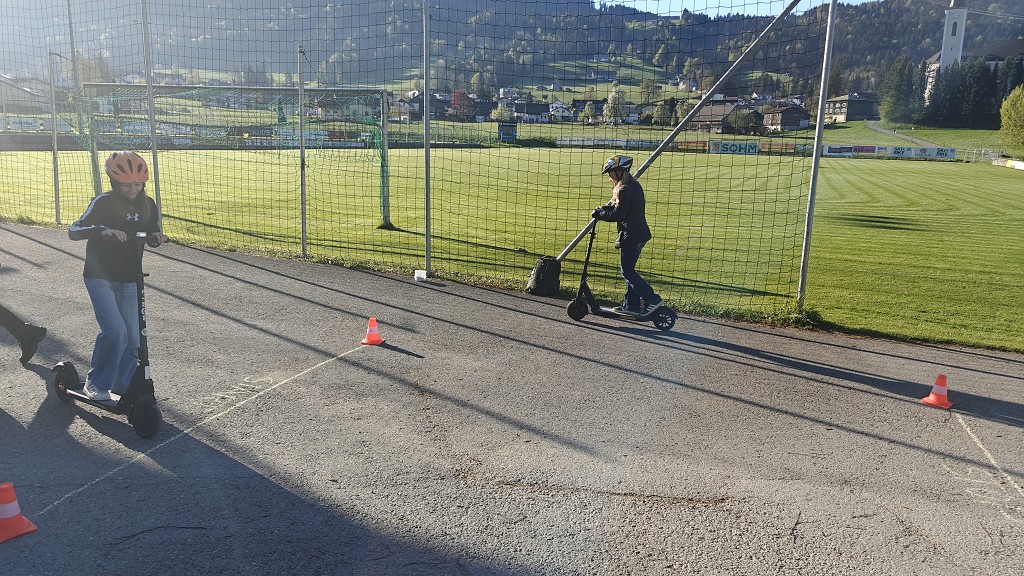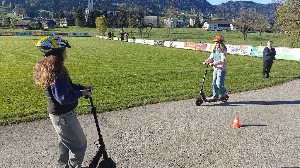Am 23. April 2026 stand der Vormittag für die 1. und 2. Klassen ganz im Zeichen der Verkehrssicherheit. Am Sportplatz Alberschwende lernten die SchülerInnen, in je zwei Unterrichtsstunden, den sicheren Umgang mit dem E‑Scooter, erfuhren hautnah, welche Gefahren der tote Winkel birgt, und erlebten eindrucksvoll das Trägheitsgesetz bereits bei „nur“ 10 km/h. Besonders prägend war das praktische Erfahren des Anhaltewegs, das bei vielen einen bleibenden Eindruck hinterließ.
