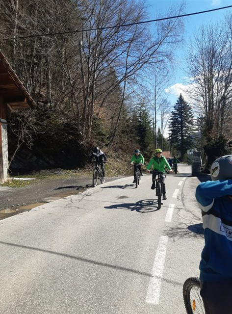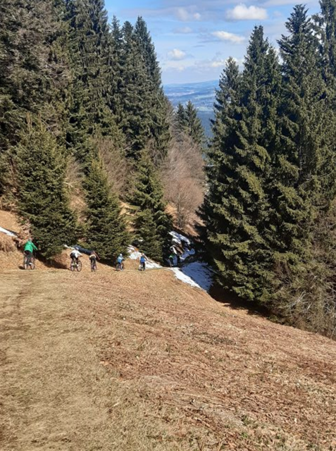 Einige Trails im Wald waren sogar noch mit Schnee bedeckt, diese zu befahren war wirklich eine Herausforderung und verlangte uns Konzentration und einiges an Fahrkönnen ab. Am Gipfelkreuz angekommen freuten wir uns auf die Abfahrt nach Buch. Bei der Bucher Volksschule machten wir eine kurze Pause, und wir fuhren schließlich über Fischbach nach Alberschwende zurück.
